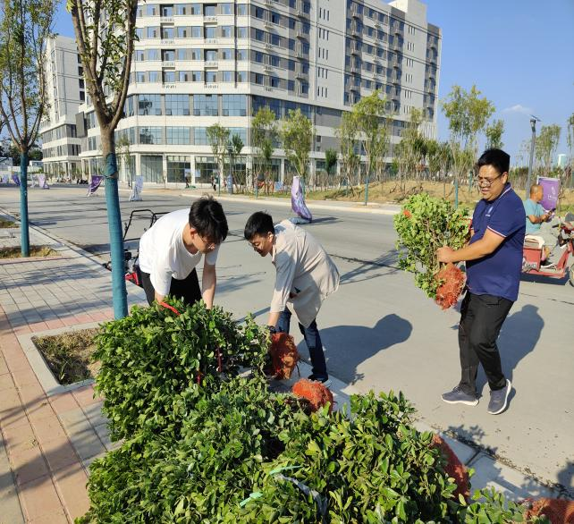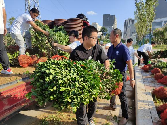 學(xué)校機(jī)關(guān)和三個(gè)學(xué)院的教工到蘭州路校園內(nèi)段西側(cè)進(jìn)行栽種冬青勞動(dòng)。有的揮锨鏟土,有的抱冬青放盆,有的抬栽好冬青的盆到擺放的道上。大家配合默契,銜接緊密,齊心協(xié)力地為學(xué)院增添新綠。此次栽植冬青共100盆,由于勞動(dòng)強(qiáng)度大,加上陽(yáng)光強(qiáng)烈,每個(gè)老師都汗流浹背。完成任務(wù)后看著整齊的綠植,老師們現(xiàn)出欣慰的笑容。