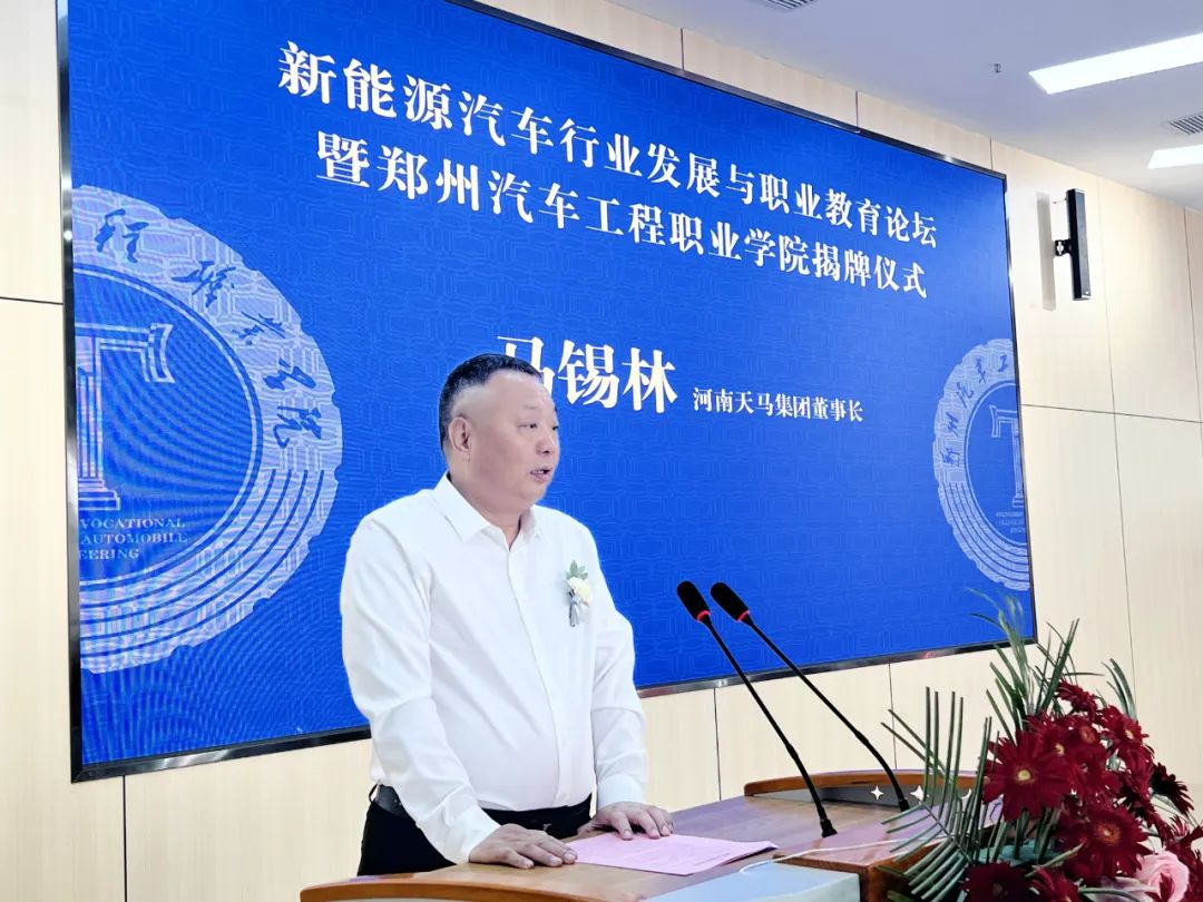 天馬集團(tuán)董事長(zhǎng)馬錫林在致辭中表示,鄭州汽車工程職業(yè)學(xué)院揭牌儀式是河南天馬實(shí)業(yè)集團(tuán)發(fā)展史上具有里程碑意義的一件盛事。在未來(lái)辦學(xué)過(guò)程中,天馬集團(tuán)將以更加飽滿的熱情和十足的干勁,不斷加大對(duì)學(xué)校的投入,全方位支持學(xué)校工作:要建設(shè)一流的設(shè)施,大力加強(qiáng)基礎(chǔ)設(shè)施建設(shè),不斷完善學(xué)校的硬件設(shè)施和運(yùn)營(yíng)管理水平;要提供一流的保障服務(wù),積極為學(xué)生提供學(xué)習(xí)生活上的各種便利,讓學(xué)生專心學(xué)習(xí)。要培育一流的學(xué)生素質(zhì),讓學(xué)生學(xué)有所成、學(xué)有所用,讓更多的學(xué)生畢業(yè)即就業(yè),成為單位的尖子和骨干。努力把鄭州汽車學(xué)院建成為特色鮮明、省內(nèi)領(lǐng)先的高等職業(yè)院校,為河南培養(yǎng)更多適應(yīng)汽車產(chǎn)業(yè)發(fā)展需要的高素質(zhì)技術(shù)技能型人才,為河南經(jīng)濟(jì)社會(huì)發(fā)展作出我們應(yīng)有的貢獻(xiàn)!