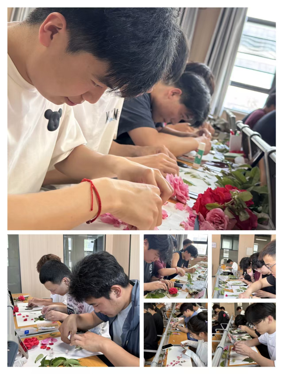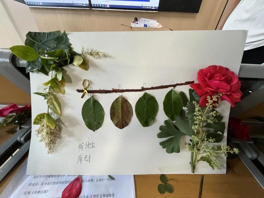 活動(dòng)于5月20日在學(xué)校知新樓 102 教室拉開帷幕。參賽者們帶著對(duì)自然的好奇與對(duì)內(nèi)心的探索,走進(jìn)校園角落采集樹葉、花瓣、枯枝等天然素材,隨后在現(xiàn)場(chǎng)利用畫紙、畫筆等工具自由創(chuàng)作。現(xiàn)場(chǎng)氛圍溫馨而充滿創(chuàng)意:有的學(xué)生用銀杏葉拼貼出展翅翱翔的 “自由之鳥”,寓意擺脫壓力束縛;有的以玫瑰花瓣為顏料,在畫布上暈染出色彩斑斕的 “心靈彩虹”,表達(dá)對(duì)生活的熱愛;更有小組合作,用樹枝搭建 “生命之樹” 裝置,以黏土塑造的嫩芽象征困境中的成長(zhǎng)與希望。