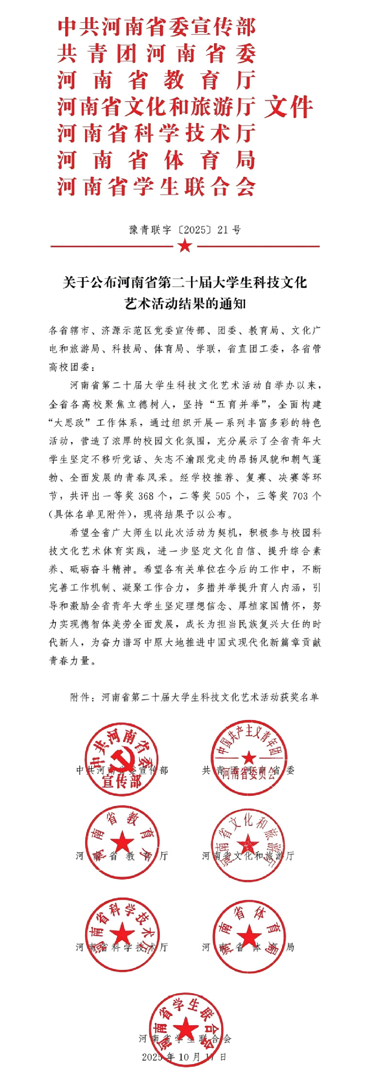 近日,由中共河南省委宣傳部、共青團(tuán)河南省委、河南省教育廳、河南省文化和旅游廳、河南省科學(xué)技術(shù)廳、河南省體育局、河南省學(xué)生聯(lián)合會(huì)聯(lián)合印發(fā)《關(guān)于公布河南省第二十屆大學(xué)生科技文化藝術(shù)活動(dòng)結(jié)果的通知》,我校榮獲三等獎(jiǎng)3項(xiàng)。