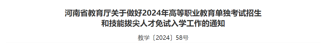 為深入貫徹黨中央、國務(wù)院關(guān)于深化考試招生制度改革的決策部署,全面落實(shí)《河南省人民政府關(guān)于印發(fā)河南省深化普通高等學(xué)??荚囌猩C合改革實(shí)施方案的通知》(豫政〔2022〕22號(hào))要求,進(jìn)一步完善高職院校分類考試招生制度,決定2024年繼續(xù)開展高等職業(yè)教育單獨(dú)考試招生(以下簡(jiǎn)稱“高職單招”)和技能拔尖人才免試入學(xué)工作?,F(xiàn)將有關(guān)事項(xiàng)通知如下。