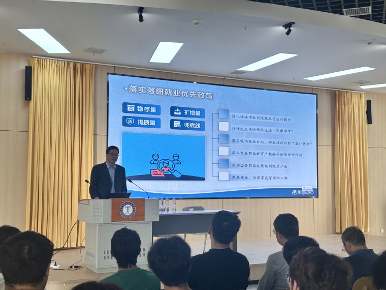 張瑞春以《當(dāng)前就業(yè)形勢與實(shí)施就業(yè)優(yōu)先戰(zhàn)略》為主題,貫徹習(xí)近平總書記關(guān)于大學(xué)生就業(yè)工作的重要論述,用詳實(shí)的數(shù)據(jù)和生動的案例,從“當(dāng)前我國就業(yè)形勢、就業(yè)領(lǐng)域面臨問題、未來就業(yè)新趨勢新舉措”三個方面,講述當(dāng)前我國就業(yè)形勢和未來就業(yè)走勢,引導(dǎo)大學(xué)生樹立理性擇業(yè)觀,跑出就業(yè)加速度。他指出,就業(yè)是最大的民生,大學(xué)生就業(yè)關(guān)系民生福祉、經(jīng)濟(jì)發(fā)展和國家未來,是黨和政府始終牽掛于心的“國之大者”,同學(xué)們要提前做好職業(yè)規(guī)劃,積極適應(yīng)市場變化。