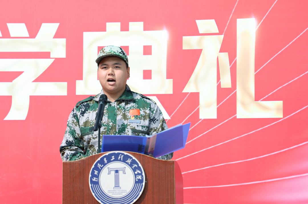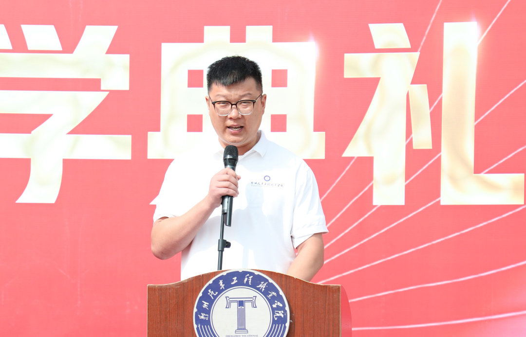 隨后,新生代表、新能源2405班韓博文和教師代表鄭杰發(fā)言,校領(lǐng)導(dǎo)給24級(jí)新生代表佩戴?;?。