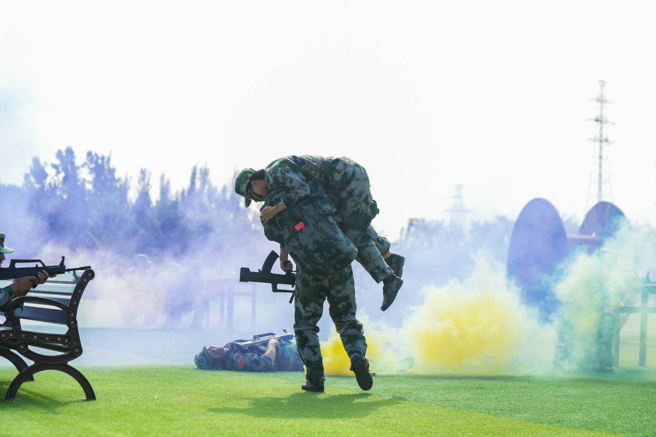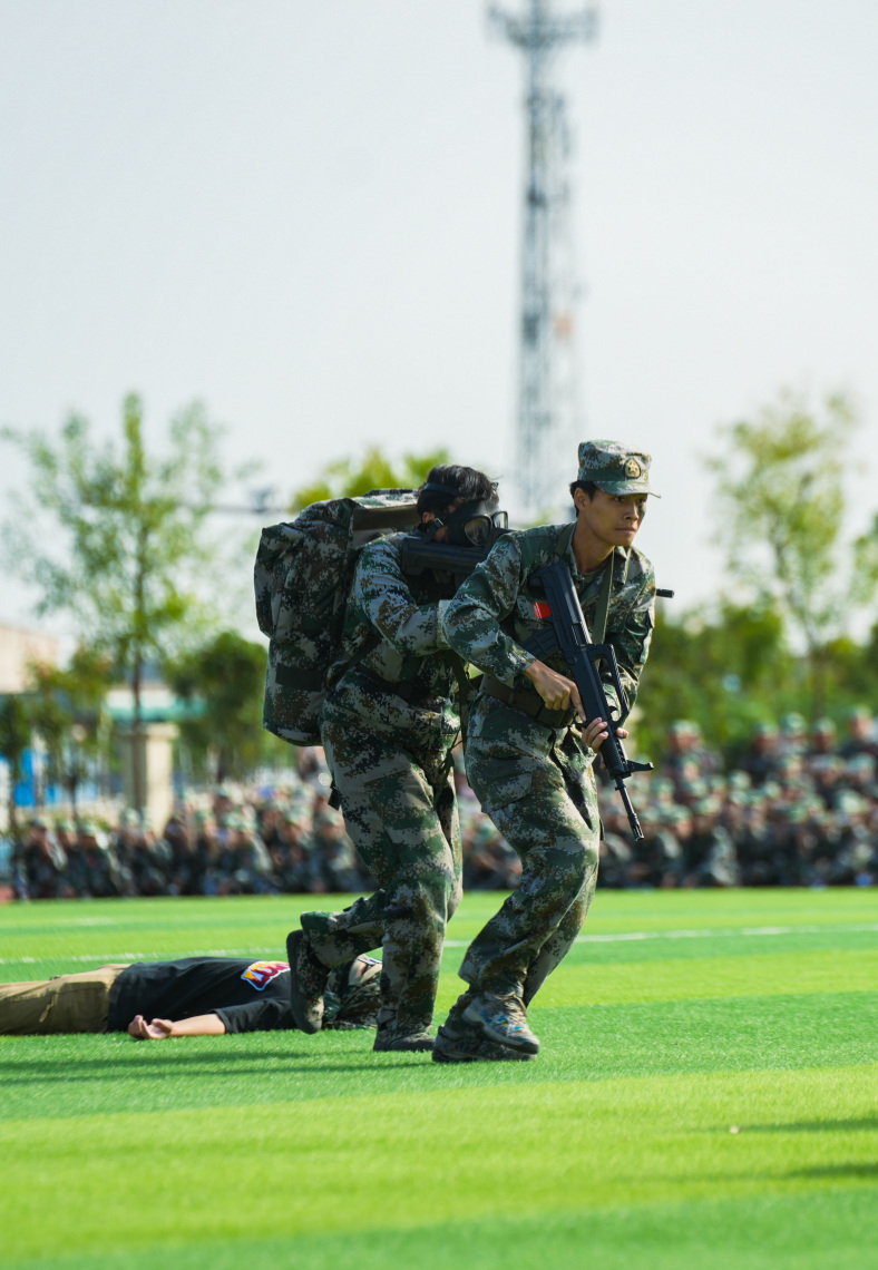伴隨著雄赳赳氣昂昂的國(guó)歌聲,典禮正式拉開(kāi)序幕。新生各分列式表演輪番上場(chǎng),他們踏著整齊的步伐,以挺拔的身姿、嘹亮的口號(hào)經(jīng)過(guò)主席臺(tái)前,接受校領(lǐng)導(dǎo)檢閱,展現(xiàn)了我校學(xué)子斗志昂揚(yáng)、朝氣蓬勃、奮發(fā)向上的精神風(fēng)貌。緊接著,拳術(shù)方陳和旗語(yǔ)方陣將氣勢(shì)磅礴的身體力量和精準(zhǔn)且富有美感的隊(duì)列動(dòng)作相結(jié)合,一招一式、一揮一舞、剛勁有力、拳拳生風(fēng),彰顯出了軍體拳的剛猛與力量,也展示出了旗語(yǔ)動(dòng)作的獨(dú)特與魅力。戰(zhàn)術(shù)方陣則向我們模擬了實(shí)戰(zhàn)場(chǎng)景,同學(xué)們動(dòng)作敏捷、相互配合、共同作戰(zhàn),充分展示了戰(zhàn)術(shù)技能和團(tuán)隊(duì)協(xié)作精神,現(xiàn)場(chǎng)師生們的掌聲熱烈,氣氛高漲。