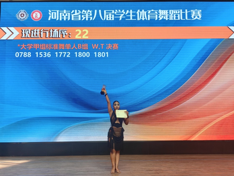10月26日,由河南省教育廳、河南省體育局主辦的“河南省第八屆學生體育舞蹈比賽”在鄭州升達經貿管理學院舉行。我校代表隊在賽場上充分展示了卓越的舞蹈技藝與風采,熱烈祝賀我校學生贏得了大學甲組??评∥枧訂稳说谌暮贸煽?!