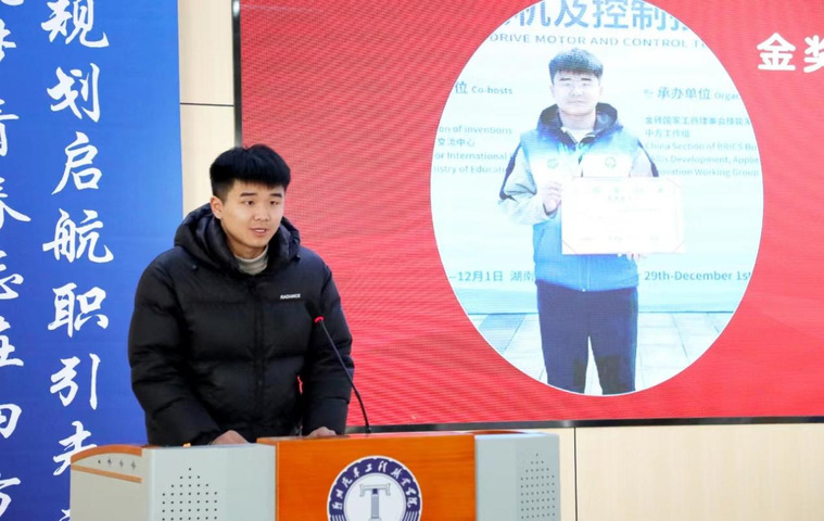 在頒獎環(huán)節(jié)之后,金獎獲得者馬文卓同學(xué)作為獲獎學(xué)生代表進(jìn)行了發(fā)言。他分享了自己的參賽經(jīng)歷和獲獎感受,表達(dá)了對學(xué)校和指導(dǎo)老師的感激之情。隨后,新能源與智能汽車學(xué)院的石金磊老師作為獲獎指導(dǎo)教師代表進(jìn)行了發(fā)言。他回顧了備賽過程中的點(diǎn)點(diǎn)滴滴,對參賽學(xué)生的努力和付出表示了肯定,并對學(xué)校給予的支持表示感謝。