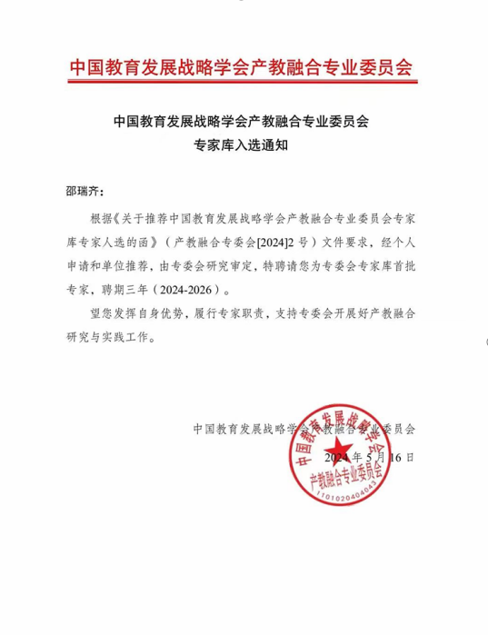 2024年5月17日,我校電商物流學(xué)院邵瑞齊副院長收到來自中國教育發(fā)展戰(zhàn)略學(xué)會產(chǎn)教融合專業(yè)委員會的受聘邀請,成為專委會專家?guī)焓着鷮<?,聘期?024-2026,為期三年。