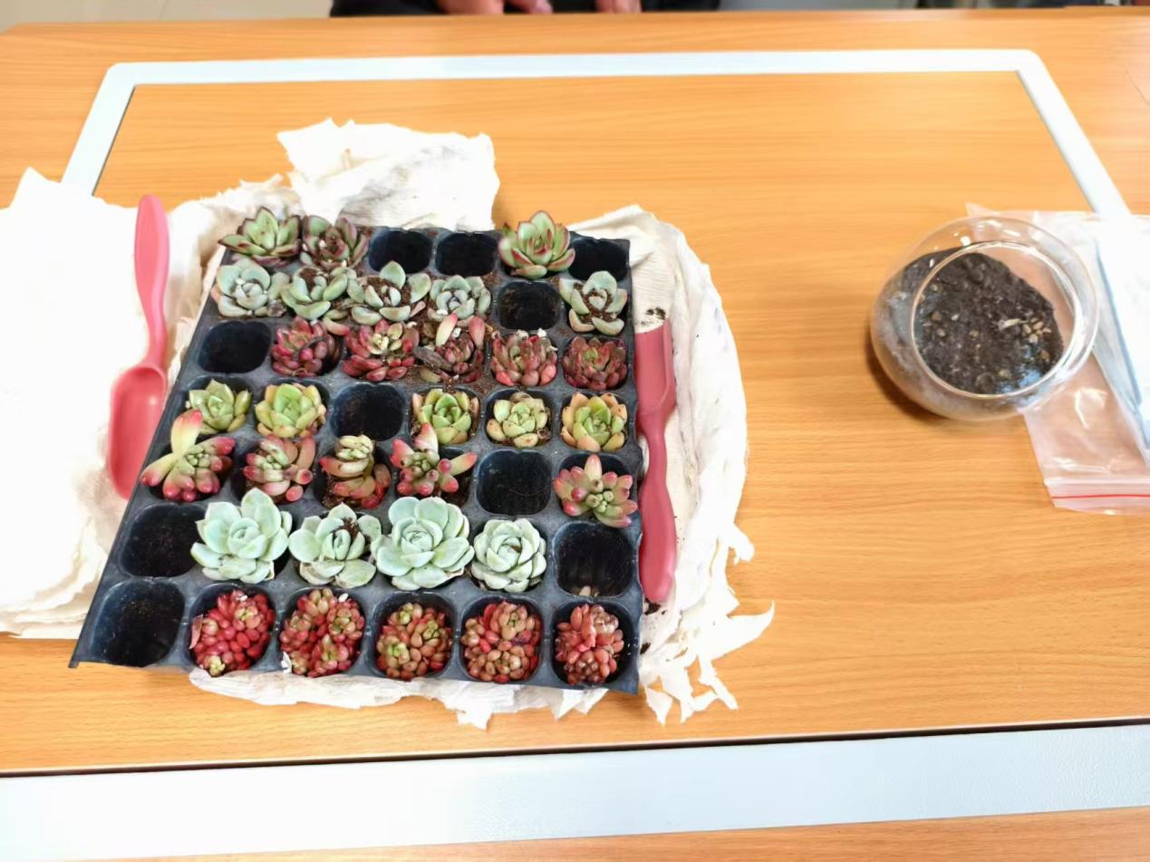 同學(xué)們瞬間化身為心靈手巧的藝術(shù)家,積極投入到創(chuàng)作之中。他們或?qū)W⒌靥暨x著多肉品種,或小心翼翼地?cái)[放著裝飾石子,每一個(gè)動(dòng)作都飽含著對(duì)美的追求和對(duì)生活的熱愛(ài)。在他們的巧手下,一個(gè)個(gè)獨(dú)具特色的多肉微景觀如雨后春筍般誕生:“森林書房”里,翠綠的多肉錯(cuò)落有致地排列,仿佛是書架上排列整齊的書籍,營(yíng)造出一種靜謐而深邃的氛圍,讓人仿佛能聽(tīng)到書頁(yè)翻動(dòng)的沙沙聲;“沙漠綠洲”中,金黃的沙石與碧綠的多肉相互映襯,宛如茫茫大漠中那一抹生機(jī)勃勃的希望,訴說(shuō)著生命的頑強(qiáng)與不屈。這些作品不僅僅是簡(jiǎn)單的植物組合,更是同學(xué)們內(nèi)心美好愿景的生動(dòng)寫照,是他們對(duì)理想生活的一種詩(shī)意表達(dá)。