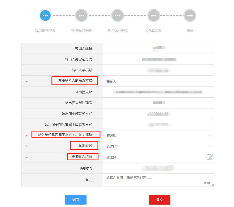 請(qǐng)大家認(rèn)真完成以上步驟,仔細(xì)檢查信息是否填寫完整、正確,再點(diǎn)擊提交,并及時(shí)跟進(jìn)轉(zhuǎn)接進(jìn)程。有問題可聯(lián)系校團(tuán)委組織部或前往辦公室進(jìn)行咨詢。