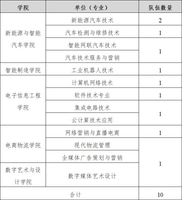 以專業(yè)為單位,新能源汽車技術(shù)專業(yè)、汽車檢測(cè)與維修技術(shù)專業(yè)、智能網(wǎng)聯(lián)汽車技術(shù)專業(yè)、汽車技術(shù)服務(wù)與營(yíng)銷專業(yè)、工業(yè)機(jī)器人技術(shù)專業(yè)、計(jì)算機(jī)網(wǎng)絡(luò)技術(shù)專業(yè)、軟件技術(shù)專業(yè)、集成電路技術(shù)專業(yè)、云計(jì)算技術(shù)應(yīng)用專業(yè)、網(wǎng)絡(luò)營(yíng)銷與直播電商專業(yè)、現(xiàn)代物流管理專業(yè)、全媒體廣告策劃與營(yíng)銷專業(yè)、數(shù)字媒體藝術(shù)設(shè)計(jì)專業(yè),共計(jì)13個(gè)專業(yè),選拔出10支隊(duì)伍。