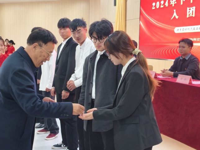 黨委書記張瑞春、副校長趙國運、團委書記唐曉分別為新團員代表戴上熠熠生輝的團徽。這不僅是極大的榮譽,更是沉甸甸的責任,提醒著他們時刻牢記團員身份,在日常學習、生活中爭做優(yōu)秀共青團員,發(fā)揮先鋒模范作用。